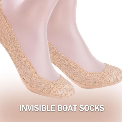 • Set contents- Contains 6 pairs of nude invisible lace socks. The socks have lovely lace embroidery on the surface.The elastic silicone gel goes around the top line of the sock to keep it from slipping off your foot. Premium silicone won’t cause discomfort