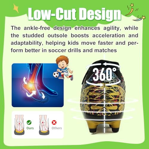 • Low-Cut Design:The ankle-at no charge design enhances agility, while the studded outsole boosts acceleration and adaptability, helping kids move faster and perform better in soccer drills and matches