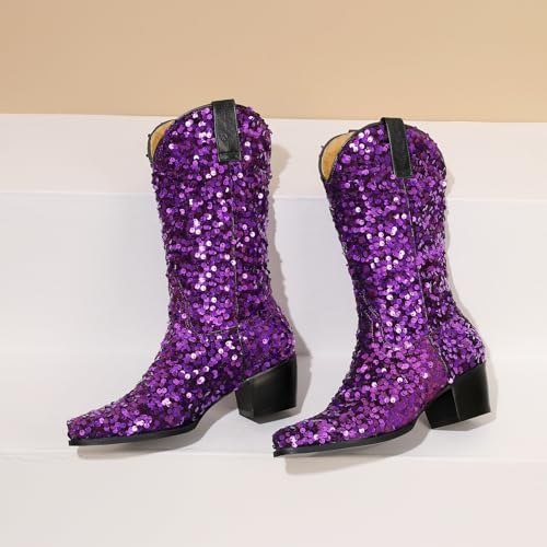 More information about KIKIVIVI Women's Glitter Sequin Mid Calf Boots: Snip Toe, Chunky Block Heel, Sparkly Cowboy Cowgirl Boots for Women - Black