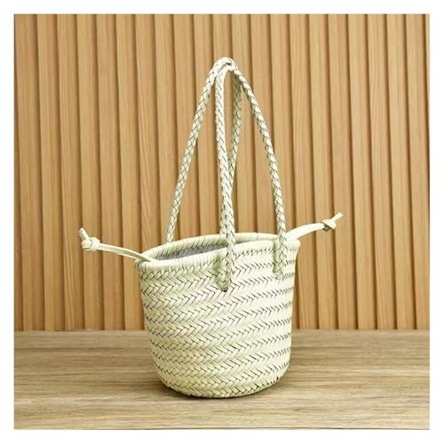 popular ! Top Layer Cowhide Hand Knitting Woven Shoulder Bag Vintage Leather Vegetable Basket Travel Beach Tote Bag(A4 White)