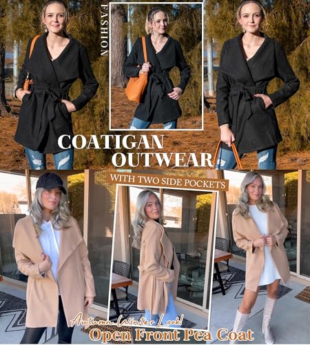 AOVDE Women's Winter Wool Coat: enduring Lapel Collar Jacket - Casual Mid-Long Open Front Blend Overcoat With Belt