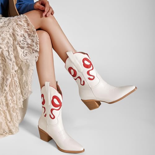 Outer material: Polyurethane (PU)Closure type: Pull-OnUnique Western Design:These cowboy boots showcase classic Western - style embroidery and cut - out details, blending traditional cowboy charm with a modern twist. The distinctive bows patterns on the shaft add an eye - catching element, making them a standout choice for those who love to express personal style with a touch of Western flair.Quality Material & Construction:Crafted from durable faux leather, the boots offer a sleek and polished look while being easy to maintain. Reinforced stitching and a sturdy block heel ensure stability and long - lasting wear, providing reliable support for all - day comfort.Comfortable Fit & Wear:Designed with a comfortable fit in mind, these boots feature a well - shaped pointed toe and a manageable block heel. The pull - on style with convenient side loops allows for easy on and off, while the soft inner lining ensures a cozy feel against the skin, reducing friction and discomfort.Versatile Styling Options:Perfect for adding a bold statement to any outfit, these cowboy boots can be paired with jeans for an authentic Western look, or dressed up with dresses and skirts for a fashion - forward ensemble. Ideal for music festivals, casual outings, or even adding an edgy touch to a night - out wardrobe.Easy Care & Maintenance:To keep these boots looking their best, simply wipe clean with a damp cloth to remove dirt and stains. The faux leather material is resistant to water spots (when cared for properly), and regular polishing is not required, making them a low - maintenance yet stylish footwear option. Perfect for everyday use. High quality materials and excellent craftsmanship ensure long-lasting durability.
