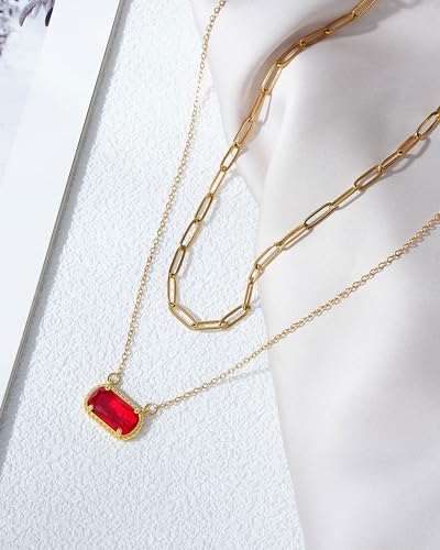 popular ! Lourny Gemstone Birthstone Pendant Layered Necklace for Women Trendy, 18K Gold Plated Paperclip Chain Preppy Choker Charm Necklace for Women Wife Jewelry