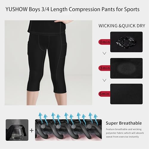YUSHOW Boys Compression Pants 3/4 Length with Pocket prompt Dry Basketball Tights Boys Leggings for Athletic Running Sports