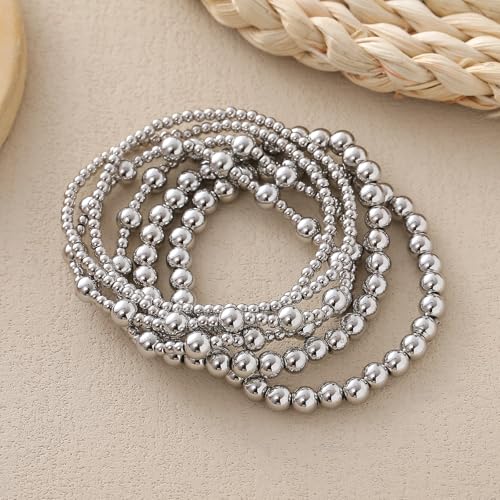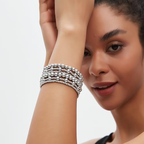 Gold Silver Bracelets for Women,Stackable Bead Ball Bracelets 14K Gold Plated Beaded Bracelet Adjustable Elastic Jewelry