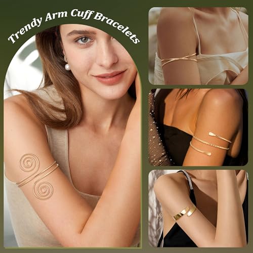 Material: MetalMetal type: BrassClasp type: No-clasp-typeGem type: No gemstoneItem type name: Cuff BraceletsGOLD ARM CUFF:A set of arm bracelet set includes 6 different contemporary gold upper arm cuffs.Minimalist arm cuff bracelet,coil swirl upper armlet,wire arm bracelet,leaf bracelet,each arm cuff is adjustable.You can choose the suitable combination armlet set according to your needsMINIMALIST ARM CUFF BANGLE:These cuff armband are made of alloy,lead-free and nickel-free.They maintain their color for a long time and are not easy to fade.The surface is highly polished,smooth to the touch,ensuring a comfortable wearing experience while exuding a dazzling lusterADJUSTABLE ARM CUFF:With an open design,these adjustable upper arm bands are easy to put on and take off.They can be gently adjusted to fit most arm sizes(8.8-11 inches),and after multiple bending tests,they still maintain their original shape.They are sturdy and wear-resistant,and will not deform or break even with frequent adjustmentsTRENDY CUFF BANGLE BRACELETS:These adjustable upper armlet suit various fashion tastes and occasions.Perfect for daily wear or events such as cosplay,steampunk gatherings,art performances,costume parties,gothic and punk events,fashion shows,photo shoots,weddings,bridal wear,and balls,they will effortlessly make you stand outJEWELRY CARE INSTRUCTION:To maintain the luster and longevity of your jewelry,gently clean it with a soft clean cloth.Avoid exposing it to harsh chemicals,extreme temperatures.Store your jewelry separately to prevent scratches and tangling Perfect for everyday use. excellent materials and excellent craftsmanship ensure long-lasting durability.