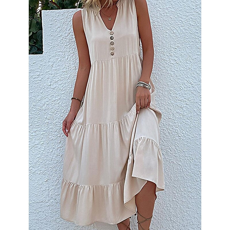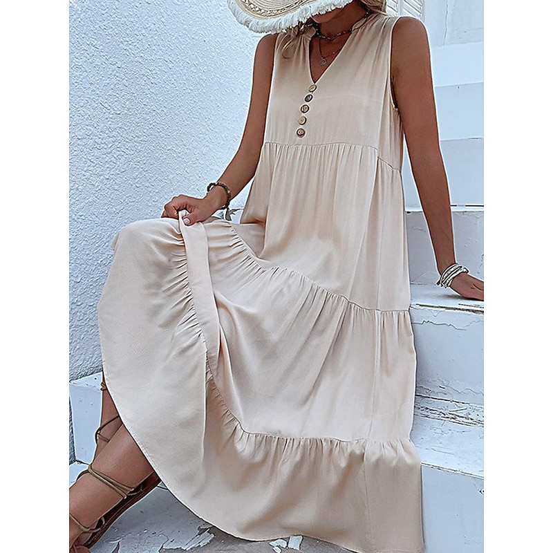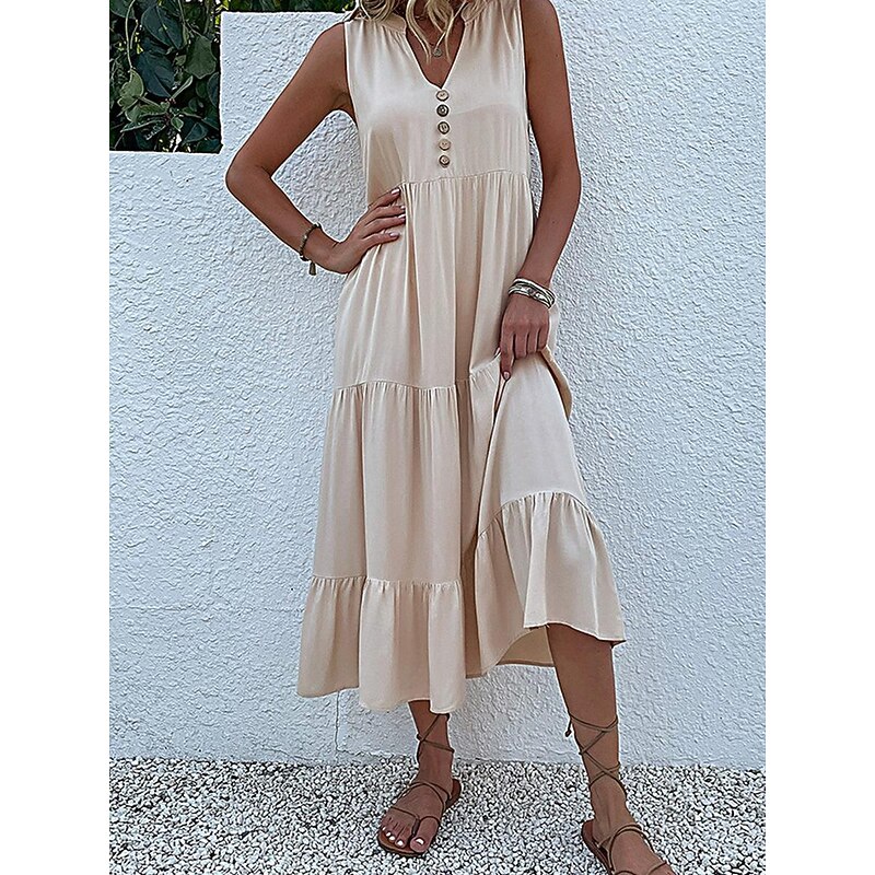 Highlights [Fabric] : Crafted from soft, breathable cotton, this dress offers a micro-elastic fit that ensures comfort and ease, making it a perfect choice for the summer season. The high-quality fabric is lightweight and provides a flowy, airy feel, ideal for staying cool in warm weather. [Silhouette] : The dress features a loose fit design that drapes elegantly, with a midi-length that adds a touch of sophistication. The sleeveless tank style is both versatile and flattering, providing a relaxed yet chic look suitable for various occasions. [Design Highlights] : Showcasing a V-neckline and a button-down front, this dress combines classic elements with new-age flair. The tiered ruffle design adds gentle volume and a bohemian vibe, while decorative buttons provide a modern accent to the overall aesthetic. [Occasions] : Perfect for casual outings, street style events, or laid-back beach days, this dress is designed to blend comfort with style. Whether attending summer gatherings or enjoying leisurely weekends, it offers both elegance and ease for diverse summer occasions. [Size Range] : Available in sizes S, M, L, and XL, this dress caters to a range of body types, ensuring a comfortable and flattering fit for every woman. Choose from a variety of colors including green, black, pink, apricot, and light blue to suit your personal style.