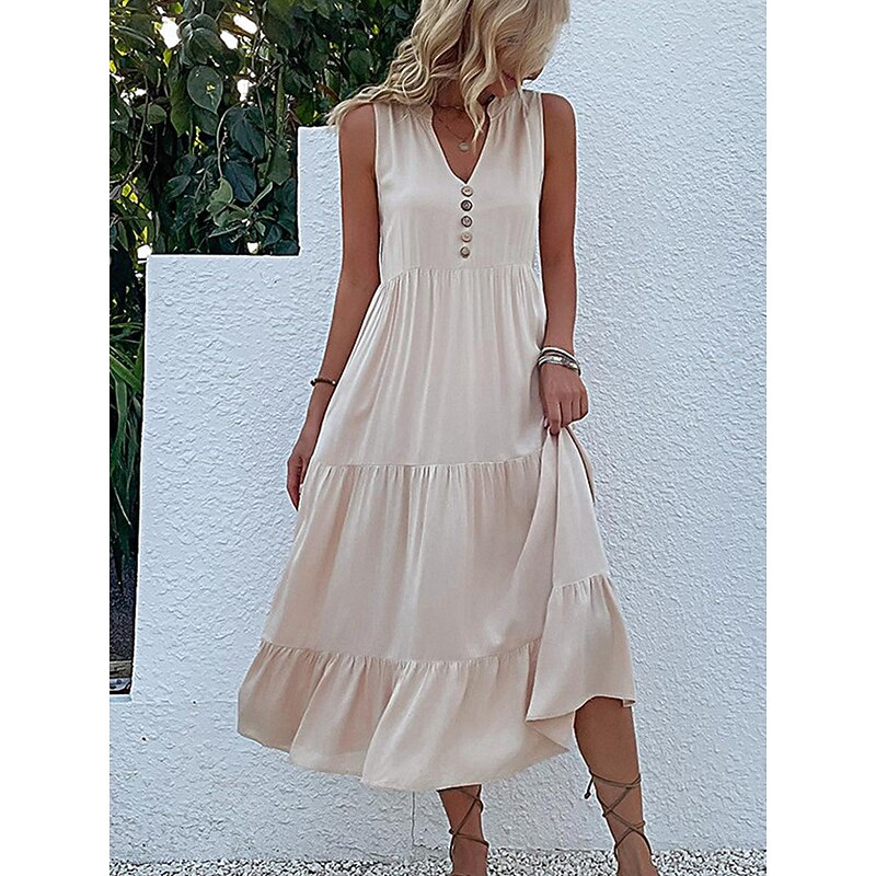 popular ! Women's Casual Dress Midi Dress Cotton Ruffle Button Basic V Neck Sleeveless Black Pink Green Color