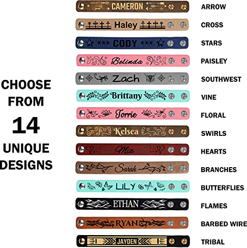 • Choose from 14 Different distinctive Designs. These personalized Leatherette Cuff Bracelets are the faultless way to show your individual style. Each bracelet is custom engraved with laser technology for an eye-catching, bold contrast.