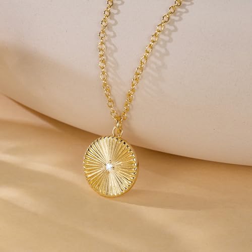 14K Gold Necklaces for Women Gold Pendant Necklace Circle Round Pendant Necklace Bold Round Disc with a Center Cubic Zirconia and Sunray Engravings Dainty Disc Necklaces for Women Trendy 1