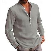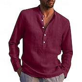 popular ! Men's Shirt Linen Shirt Band Collar Shirt Summer Shirt Beach Wear Solid Color Street Hawaiian Light Blue Wine Red Black White Long Sleeve Collar Summer Spring Clothing Apparel