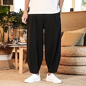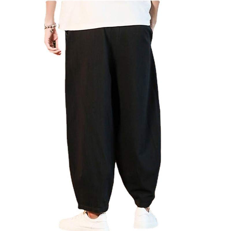 Highlights [Fabric] : Crafted from a linen cotton blend, these pants are both lightweight and breathable, making them an ideal choice for spring and summer seasons. The fabric's natural texture provides a cushy and cool wearing experience, perfect for warm weather outfits. [Fit Type] : These pants feature a regular fit with a mid-waist and a slight drop-crotch style, offering a relaxed and current silhouette. The ankle-length design with a tapered hem adds a touch of contemporary style, while maintaining a timeless appeal. [Design Highlights] : The trousers are fitted with an elastic waistband and a drawstring, ensuring adjustable comfort throughout the day. Their plain pattern and muted, earthy tones like black, red, dark blue, and gray green add versatility to your wardrobe, allowing for easy pairing with various tops. [Occasions] : Ideal for daily wear, outdoor activities, and holiday getaways. Whether you're enjoying a day at the beach or heading out for a casual gathering, these pants offer the perfect blend of style and comfort for any relaxed occasion. [Size Range] : Available in a wide range of sizes from M to 5XL, these pants cater to a variety of body types, ensuring a comfortable fit for everyone.