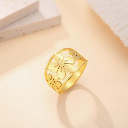 Bohemian Hollow Flower Ring for Women 14K Gold Stainless Steel Elegant Flower Ring Daily Band Exquisite Jewelry Wedding Band Promise Rings 6