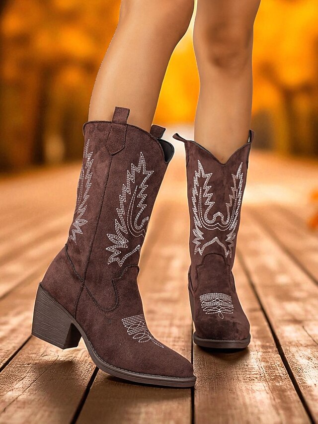Women's Suede Cowboy Boots with Embroidered Design Western Mid-Calf Block Heel Retro Style Fashion Boots for Urban Casual Wear 12