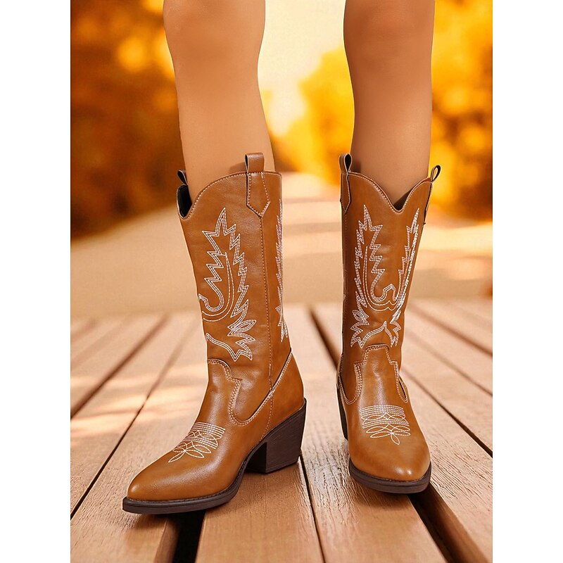 Women's Suede Cowboy Boots with Embroidered Design Western Mid-Calf Block Heel Retro Style Fashion Boots for Urban Casual Wear 9