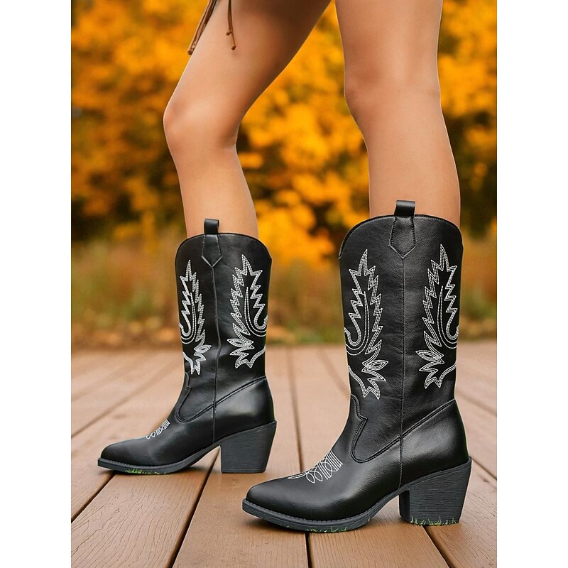Women's Suede Cowboy Boots with Embroidered Design Western Mid-Calf Block Heel Retro Style Fashion Boots for Urban Casual Wear 10