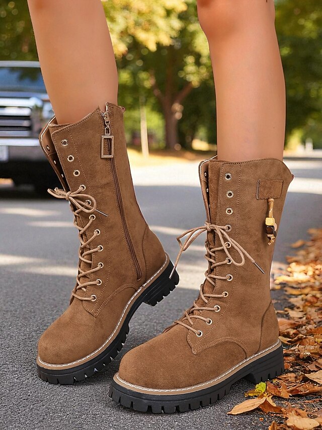 Women's Mid-Calf Lace-Up Combat Boots with Chunky Sole, Casual Military Style Boots for Outdoor and Streetwear 6