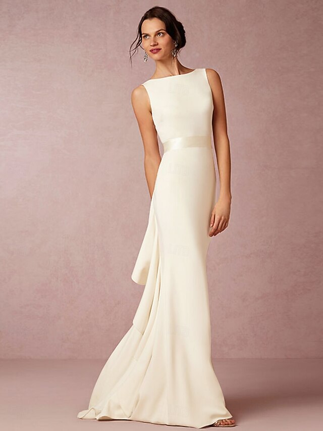 Why Choose Beach Wedding Hall Open Back Casual Wedding Dresses Sheath Scoop Neck Sleeveless Sweep / Brush Train Stretch Fabric Bridal Gowns With Draping?