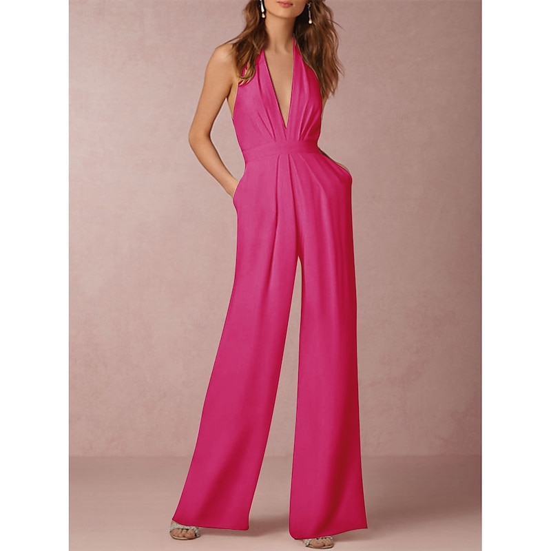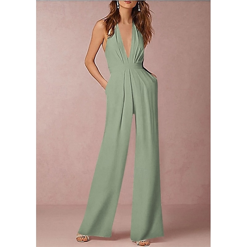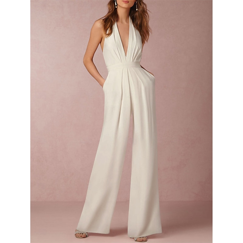 More information about Hall Sexy Casual Wedding Dresses Tuxedo Dress Jumpsuits Halter Neck Sleeveless Floor Length Satin Bridal Gowns With Pleats