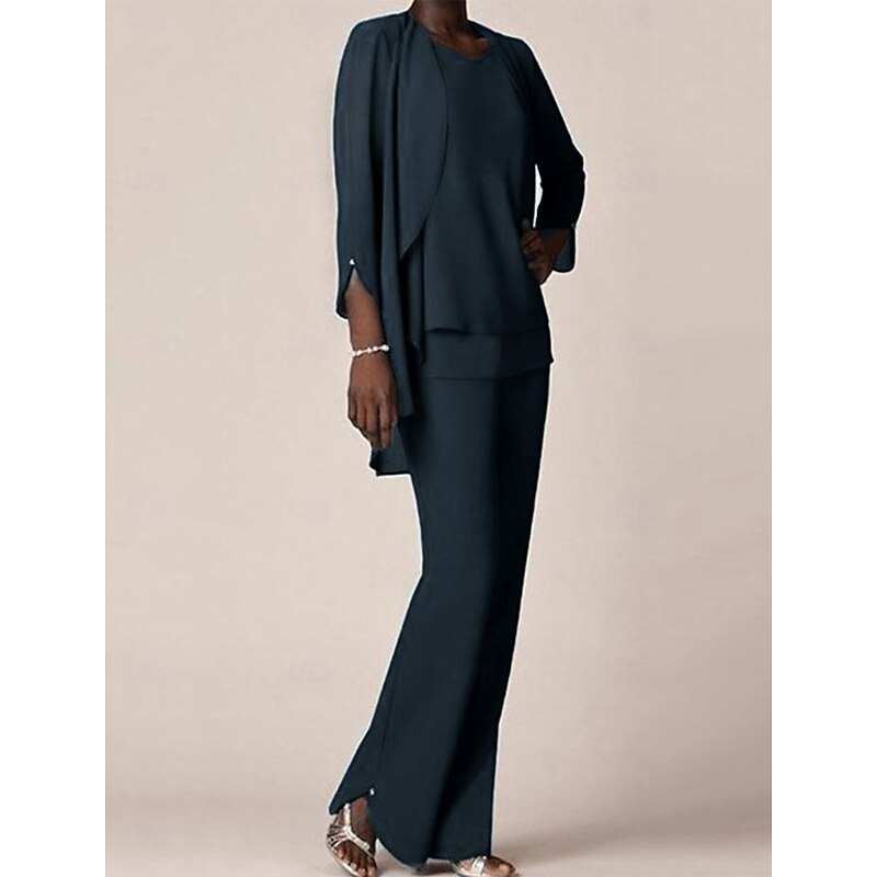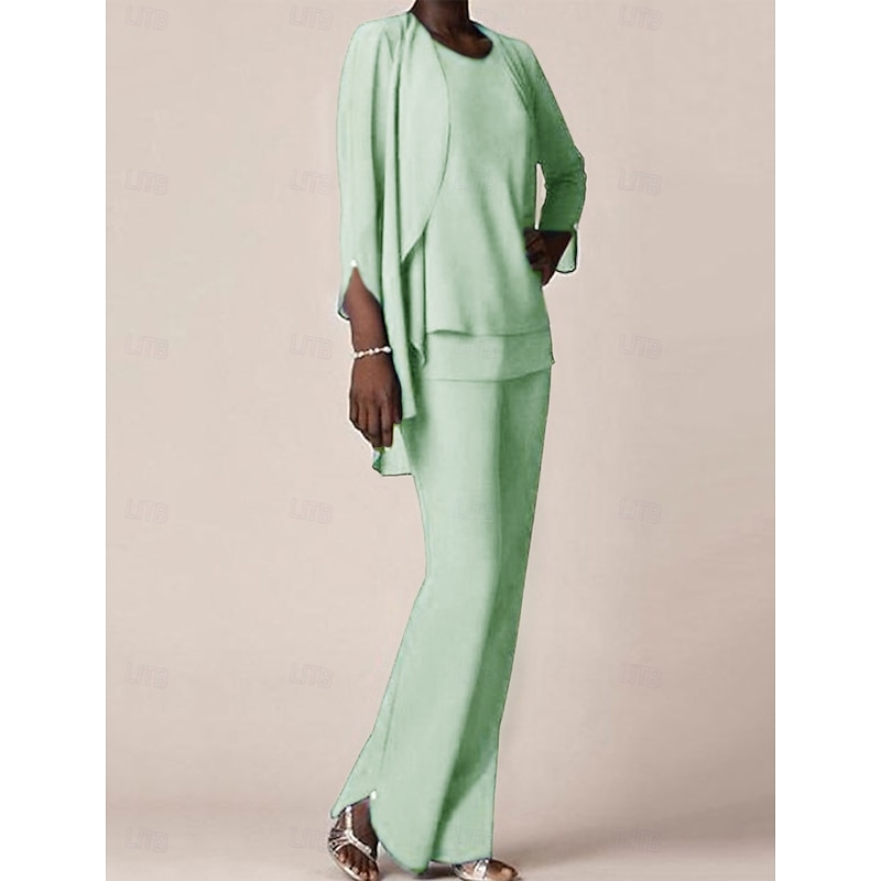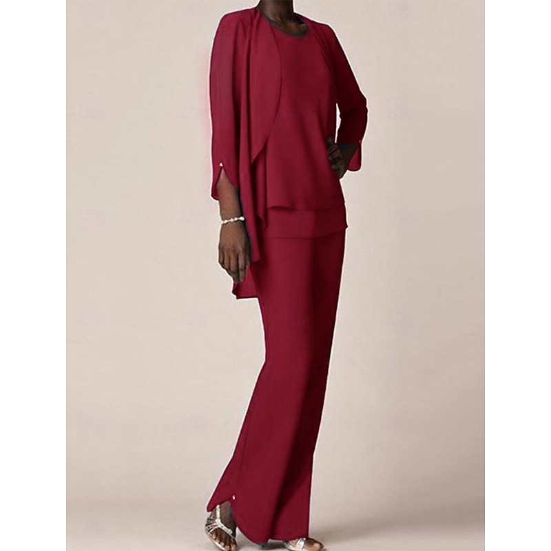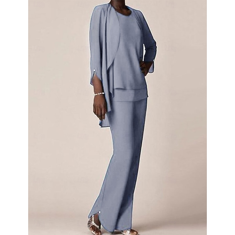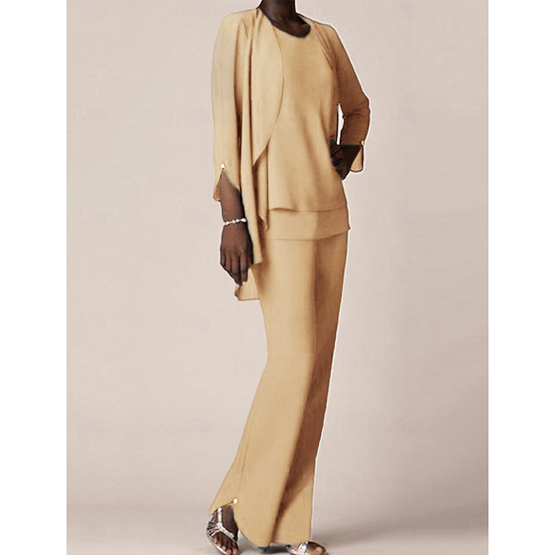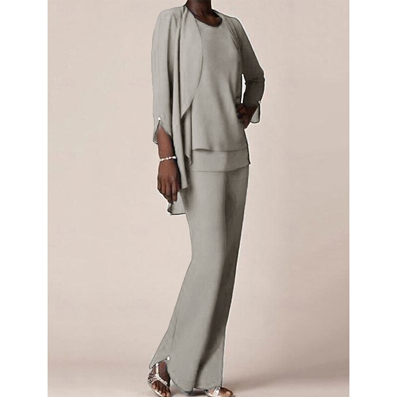 More information about 3 piece Pantsuit Mother of the Bride Wedding Guest Elegant V Neck Floor Length Chiffon 3/4 Length Sleeve with Ruffles