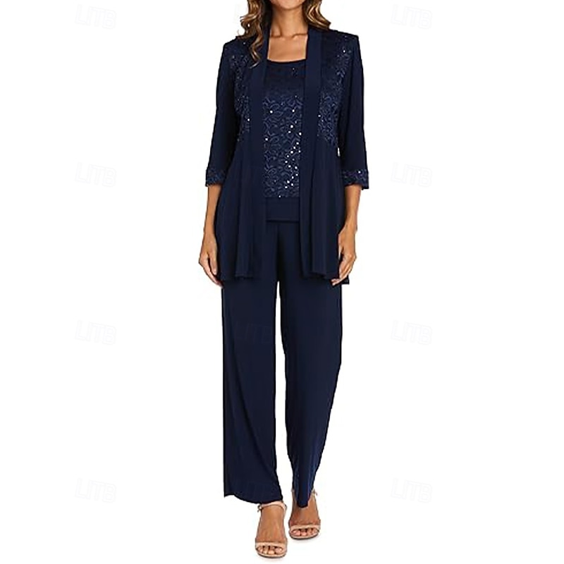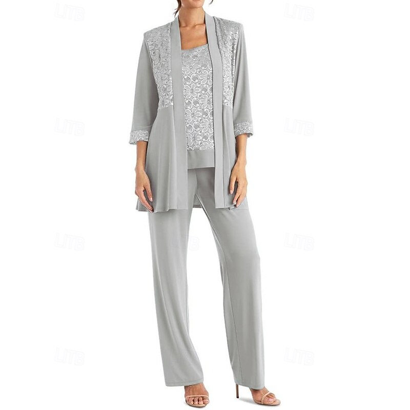 More information about Pantsuit 3 Piece Pantsuit Mother of the Bride Dress Elegant Vintage basic Boat Neck Ankle Length Stretch Chiffon Half Sleeve with Lace Sequin Embroidery