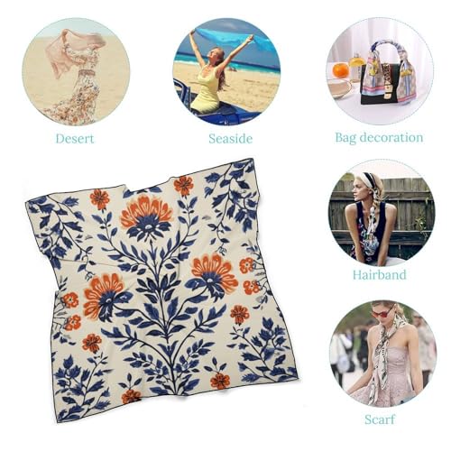Orange And Navy Blue Floral Pattern Women Hair Scarf Square Silk prefer Head Scarves Handkerchief Satin Neck Scarf