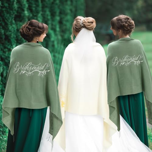 Care instructions: Hand wash gently using mild detergent with light pressing motions; If machine washing, select the 'delicate' cycle; After washing, gently squeeze out water (do not wring) and lay flat on a drying rack or clean towel, reshaping to maintain its original formOrigin: ImportedJoin Prime Cancel anytimeWedding Shawls Set: you will receive 1 pc bride pashmina shawl, 4 pcs bridesmaid pashmina scarves and 1 roll green bow satin ribbon, which adds elegance and refinement to your bridesmaid proposal gifts while creating lasting wedding memoriesReliable Material: bridesmaid shawls for wedding are made of pashmina, soft and cozy, suitable for the cold weather as winter scarf for women, shawl wraps is large enough to wear around your shoulders and around your neck, suitable for brides and bridesmaids seeking both style and cozy comfort on their special dayBride Themed Style: pashmina shawls and wraps are about 70.8 x 27.5 inches/ 180 x 70 cm, the white shawl is printed with exquisite embroidery [ Bride] , the green pashmina scarfs are printed with word [ Bridesmaid] , the satin ribbon is about 72ft, The exquisite embroidery and cohesive design create unforgettable wedding memories for your bridal partyWide Applications: pashmina wraps for women are suitable for wedding, bridal shower, bridesmaid party, birthday party, evening parties, easily matched with your coats, jackets, sweaters or dresses, also can be applied when traveling to be sophisticated and to add a layer of warmthCare Instructions: please hand wash gently using mild detergent with light pressing motions; If machine washing, select the delicate cycle; After washing, gently squeeze out water (do not wring) and lay flat on a drying rack or clean towel, reshaping to maintain its original form Perfect for everyday use. supreme materials and excellent craftsmanship ensure long-lasting durability.