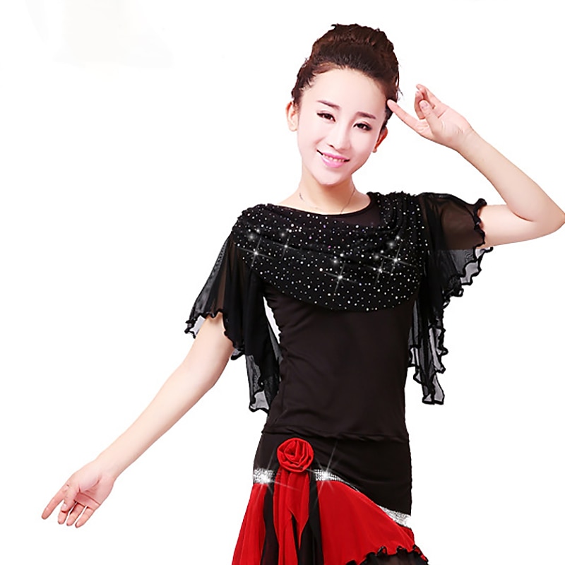 Why Choose Latin Dance Ballroom Dance Sparkle Top Ruffles Pure Color Women's Performance Training Short Sleeve Polyester?