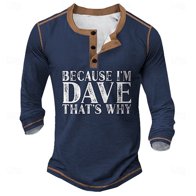 popular ! Men's Funny 'Because I'm Dave That's Why' Graphic Long Sleeve Henley Shirt