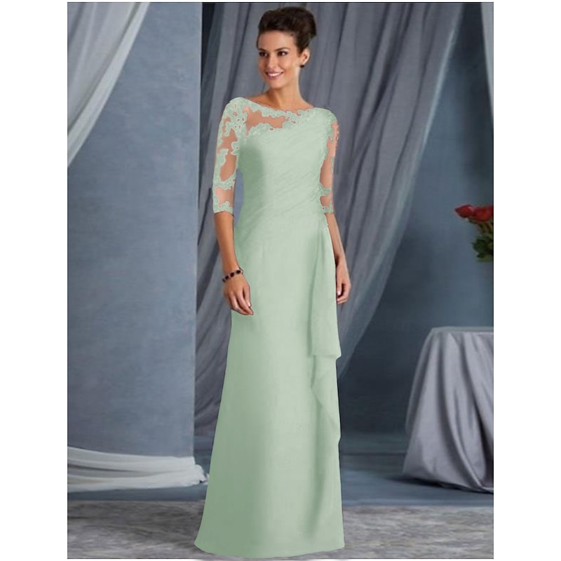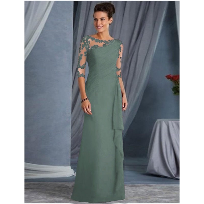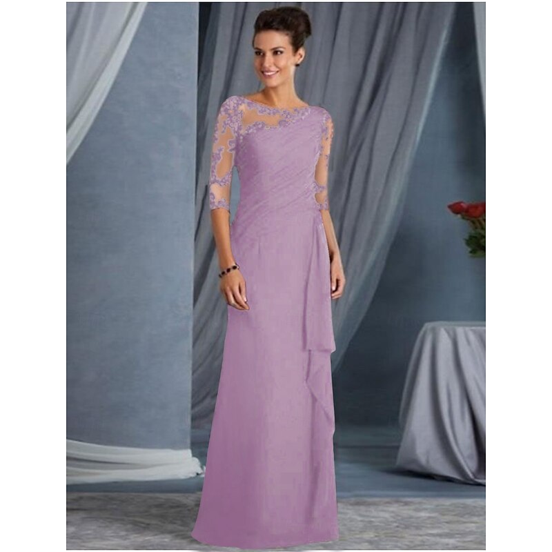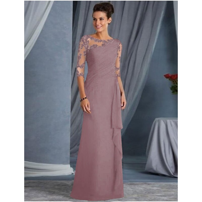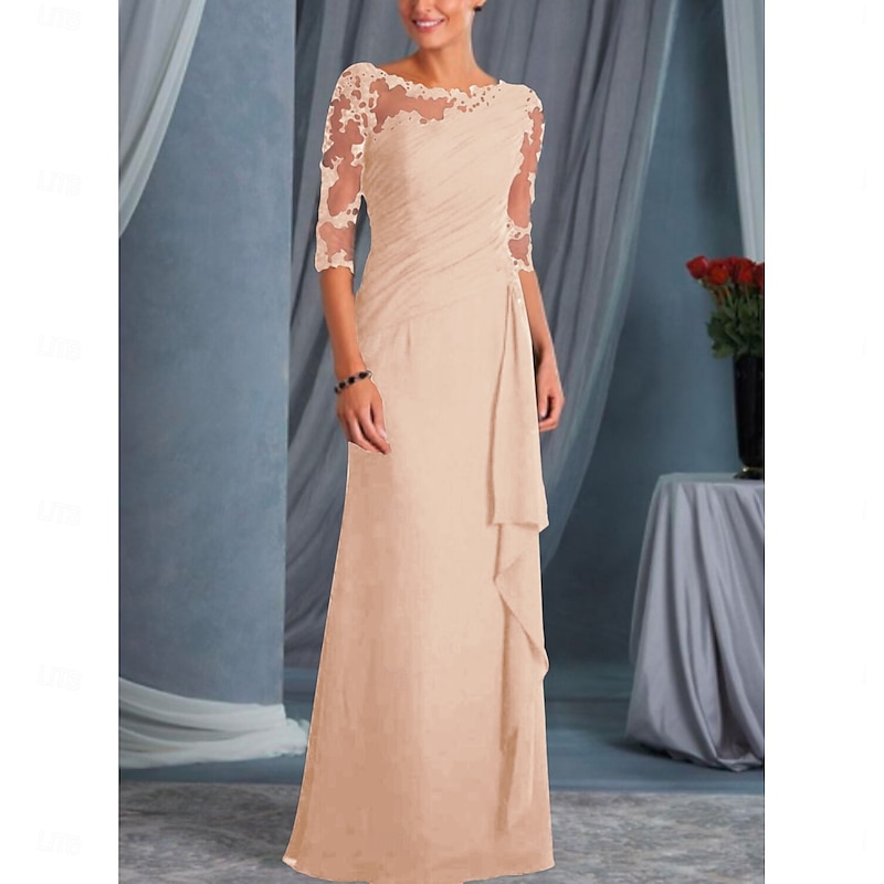 A-Line Mother of the Bride Dress Wedding Guest Plus Size Bateau Neck Floor Length Chiffon Lace Half Sleeve with Draping Appliques dress to impress