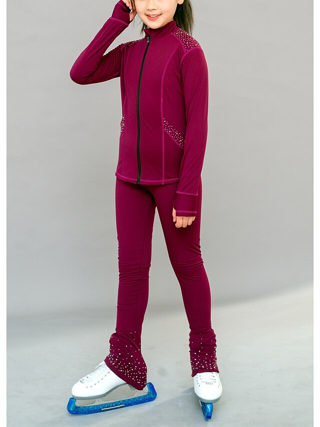 popular ! Figure Skating Fleece Jacket Figure Skating Pants Figure Skating Jacket with Pants Women's Girls' Ice Skating Jacket Tights Outfits Burgundy Patchwork Thumbhole Spandex Stretchy Training Practice