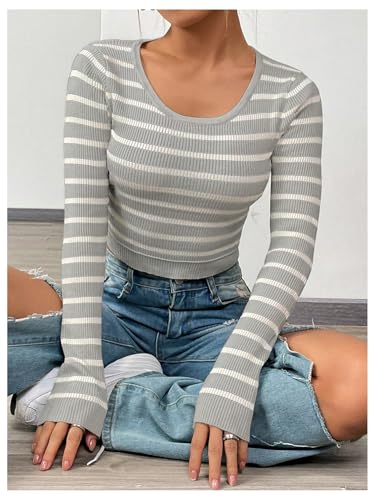 SOLY HUX Women's Fall Striped Crop Sweater Scoop Neck Long Sleeve Ribbed Pullover Jumper Tops