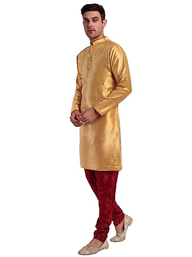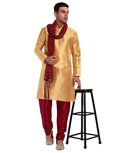 SKAVIJ Men's Art Silk Indian Ethnic Wear Kurta Pajama and Scarf Suit Festivals Season Party Dress Set (Gold, Large) 1