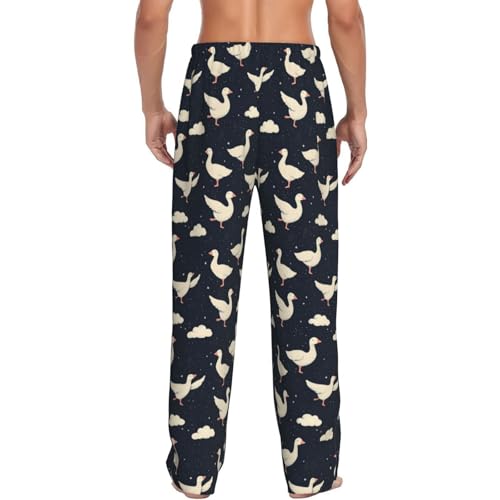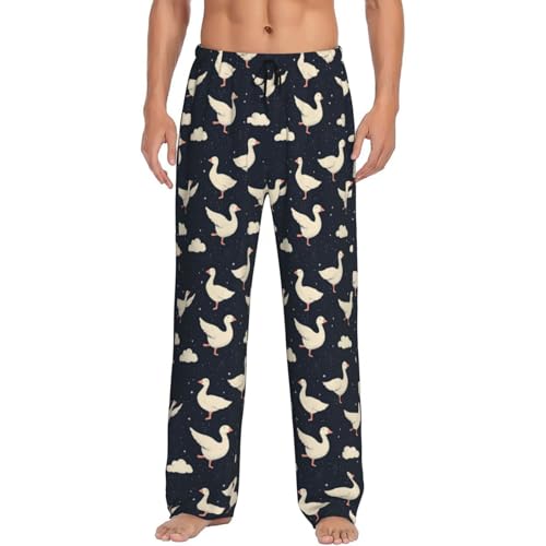 Mens Pajama Pants - White Cute Goose Print silky Sleep Lounge Pants For Men, Casual Pj Bottoms With Pockets