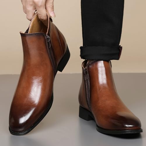 Men's Leather Slip-On Chunky Heel Chelsea Ankle Boots Fashion Pointed Toe Side Zipper Non-Slip Low Block Heel Business Dress Booties 6