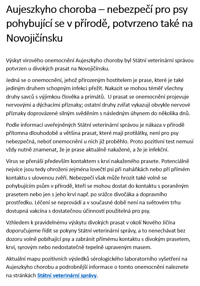 Státní veterinární správa potvrdila výskyt virového onemocnění Aujeszkyho choroby u divokých prasat na Novojičínsku. Tato nákaza představuje značné riziko pro psy pohybující se v přírodě. Přirozeným hostitelem viru je prase, které jako jediný druh dokáže infekci přežít. Pro ostatní savce (s výjimkou člověka a primátů) je však onemocnění smrtelné.
